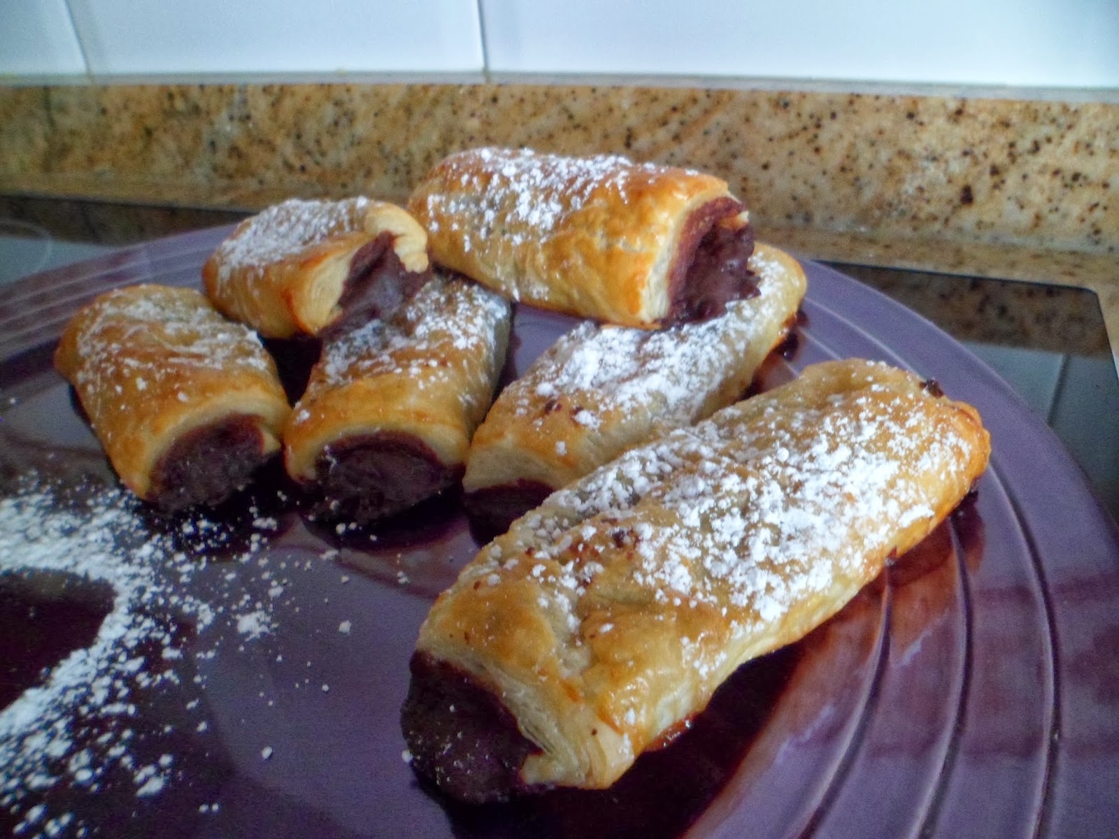 Estiramos la placa de hojaldre, la partimos en 12 cuadrados lo más similares que podamos (bueno tampoco hace falta ponerse con la regla a medir y esas cosas porque el sabor va a ser el mismo!!!), ponemos en el centro de cada cuadrado una cucharada y la repartimos haciendo una linea gruesa. Lo siguiente es cerrar cubriendo con los lados libres el chocolate para formar las napolitanas.