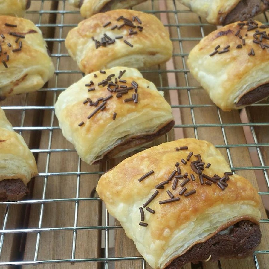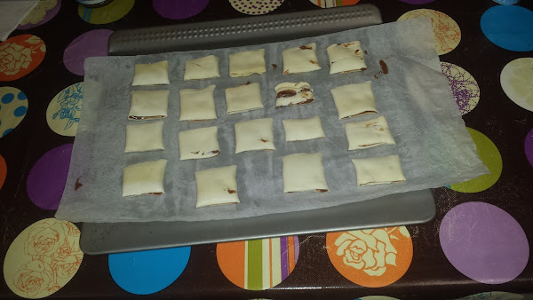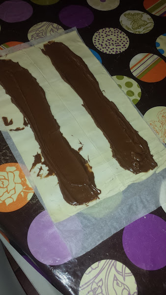 Estiramos la lámina de hojaldre y la cortamos en dos partes a lo largo, untamos crema de chocolate en los dos lados, doblamos un lado del hojaldre primero y luego el otro para que la parte que los junta quede abajo y no se abran al hornear.