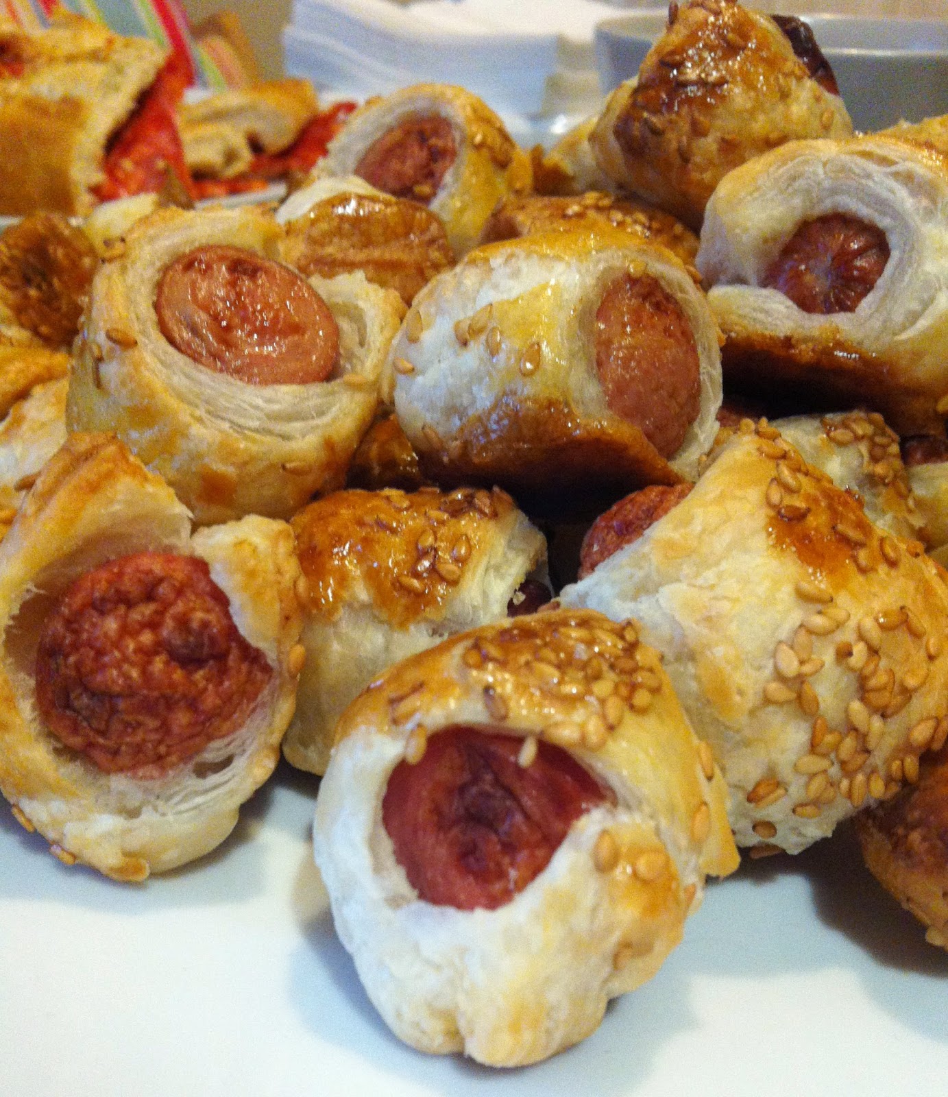 Envolver las salchichas , las rebozamos de sesamo y pintamos con huevo batido .