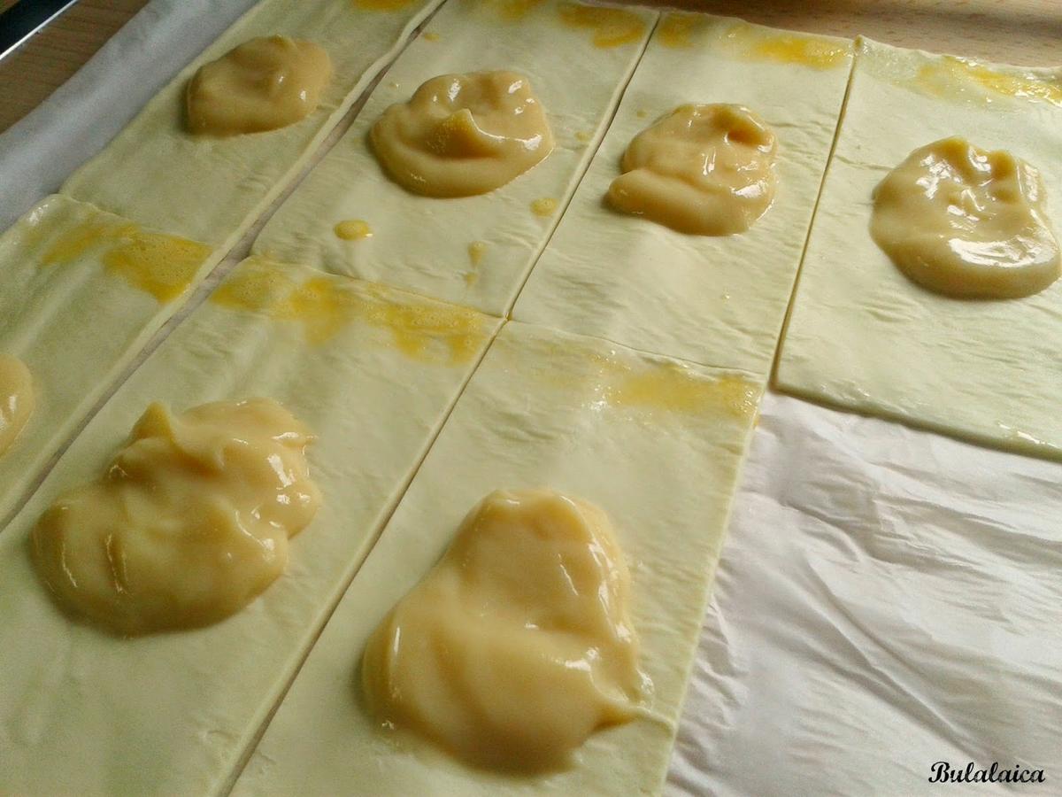 Una vez tenemos la crema reposada en la nevera (que habremos tapado bien con un film), nos ponemos a preparar la lámina de hojaldre y a dar forma a las napolitanas: