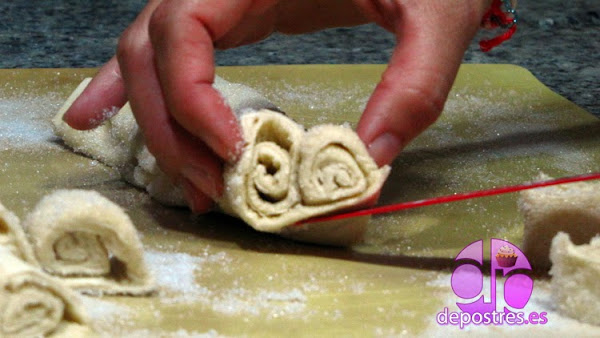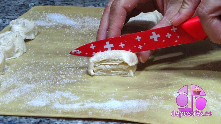 3.- Dar forma a las palmeritas: Según lo hagamos quedan con una forma o con otra. Podemos enrollar el hojaldre desde los dos extremos hacia el centro. Nos queda un cilindro largo de hojaldre. Lo cortamos en rodajitas del grosor deseado, a mi me gustan de aproximadamente medio centímetro.