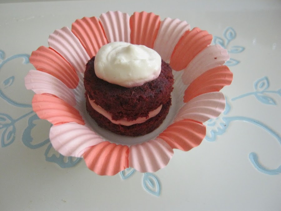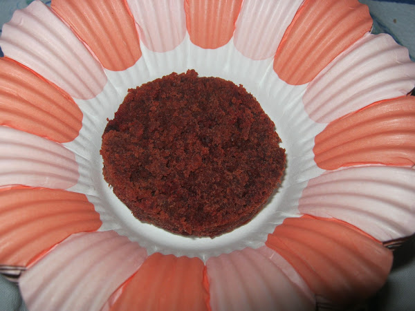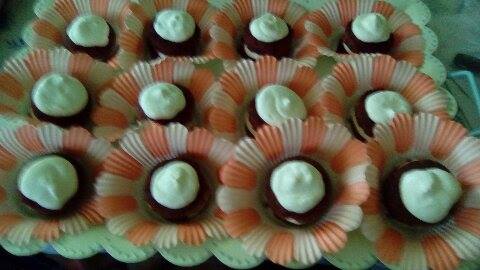 10.- Cortar el bizcocho en círculos, utilizando un cortapastas o un vaso del diámetro deseado y luego los círculos cortarlos por la mitad y rellenarlos , intercalando con la crema de queso entre cada trozo de bizcocho.