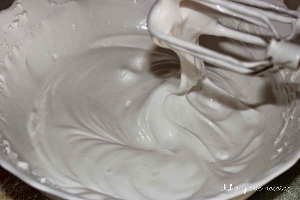 Cuando estén consistentes, vamos echando el azúcar poco a poco mientras seguimos batiendo, hasta que se forme un merengue compacto y brillante.