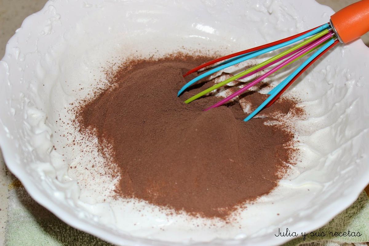 En ese momento le añadimos las dos cucharadas de cacao en polvo y batimos hasta que se incorpore bien.