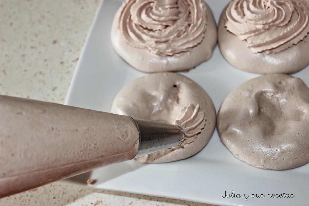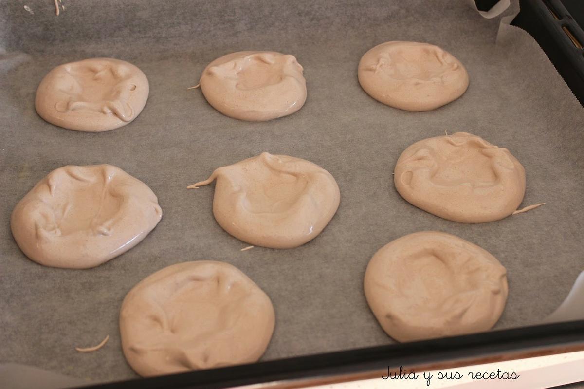 Ponemos cucharadas del merengue encima de un papel vegetal en forma redondeada haciendole un hueco en el centro.