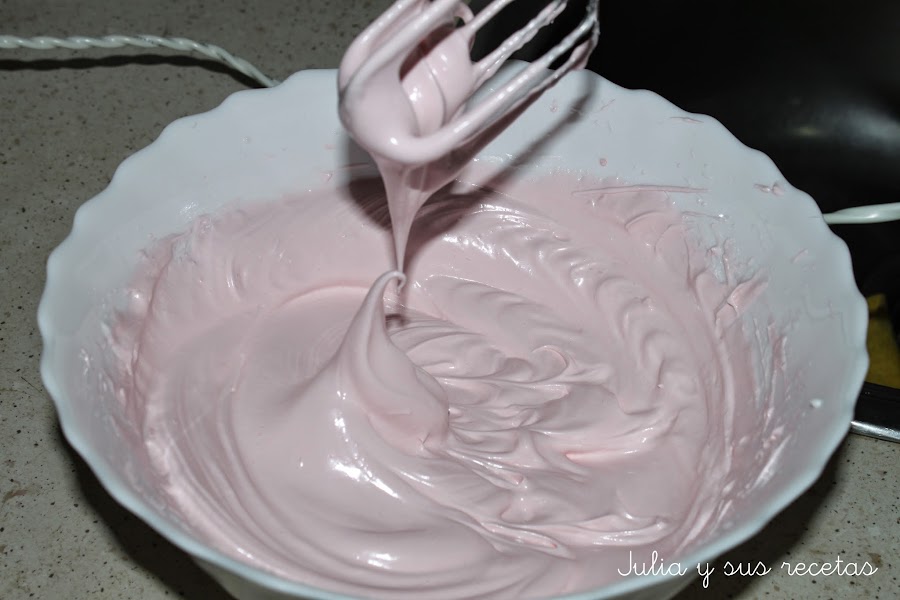 Es el momento de ponerle el colorante , seguimos batiendo hasta que el merengue forme picos.