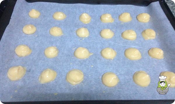 Colocamos la masa en una manga pastelera y formamos los petisús. Bañamos con huevo batido y cocemos durante unos 30 minutos en el horno precalentado a 180º. No abráis la puerta mientras dure la cocción.