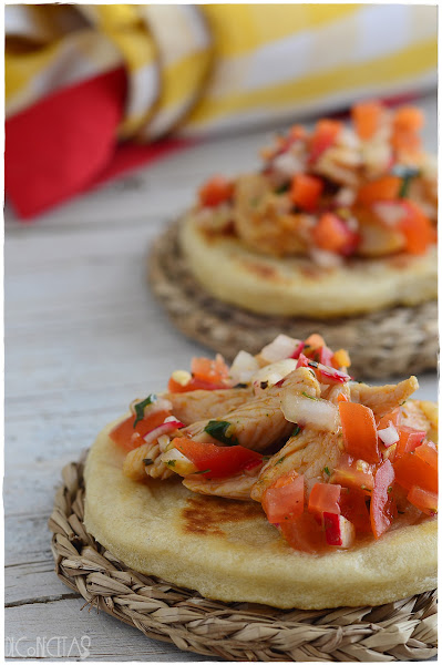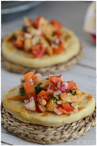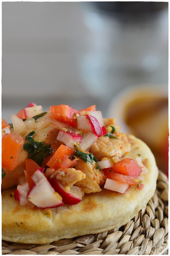 Como relleno, un salteado de pollo, salpimentado con sal, pimienta y pimentón picante, junto con tomate, cebolla, rábano y pimiento rojo bien picados.