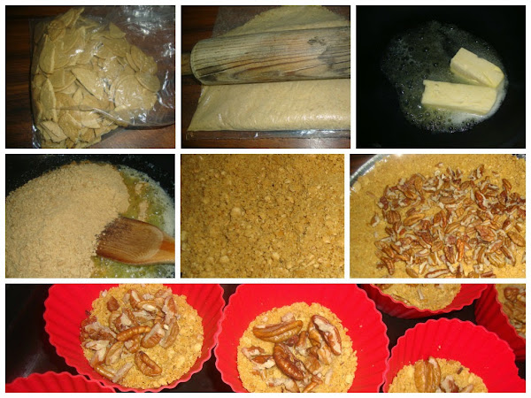 Colocamos una capa de galletas en la base de dos moldes para pie de aluminio, esa es la cantidad que nos rinde para la mezcla de queso con leche, en esta ocasión yo preparé mini pies, así es que coloqué sólo en la base, no en las paredes una buena cantidad de galleta dorada, para esta cantidad obtendrán aproximadamente 20 mini pies, y si utilizan moldes de aluminio podrán hacer dos, de los que saldrán 8 rebanadas de buen tamaño.