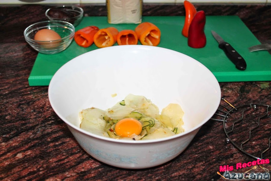 Transcurridos los 20 minutos sacaremos las patatas del horno, las pasamos a otro bol, las dejaremos que se enfríen un poco para poder añadir los huevos y la cebolla mezclamos todo bien.