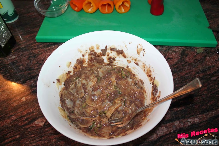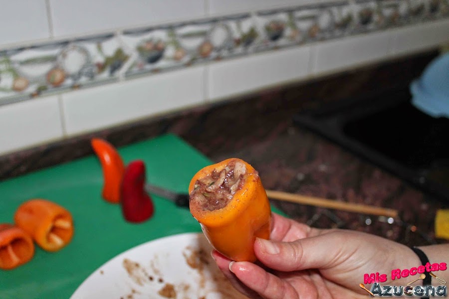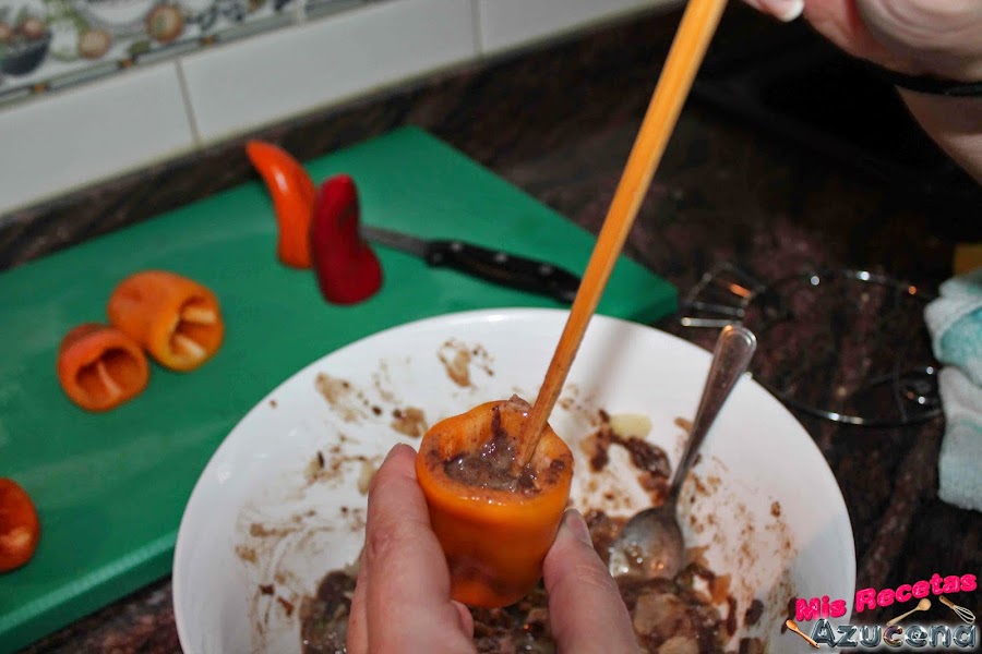 Ahora cogemos una bandeja que sea apta para horno o sartén, la ponemos al fuego, a fuego medio, cuando este caliente iremos rellenando los pimientos uno a uno, cuando tengamos un pimiento relleno le pondremos un poco de pan rallado para que no se salga el relleno y lo pondremos sobre la bandeja para que se forme una costra y no se salga.