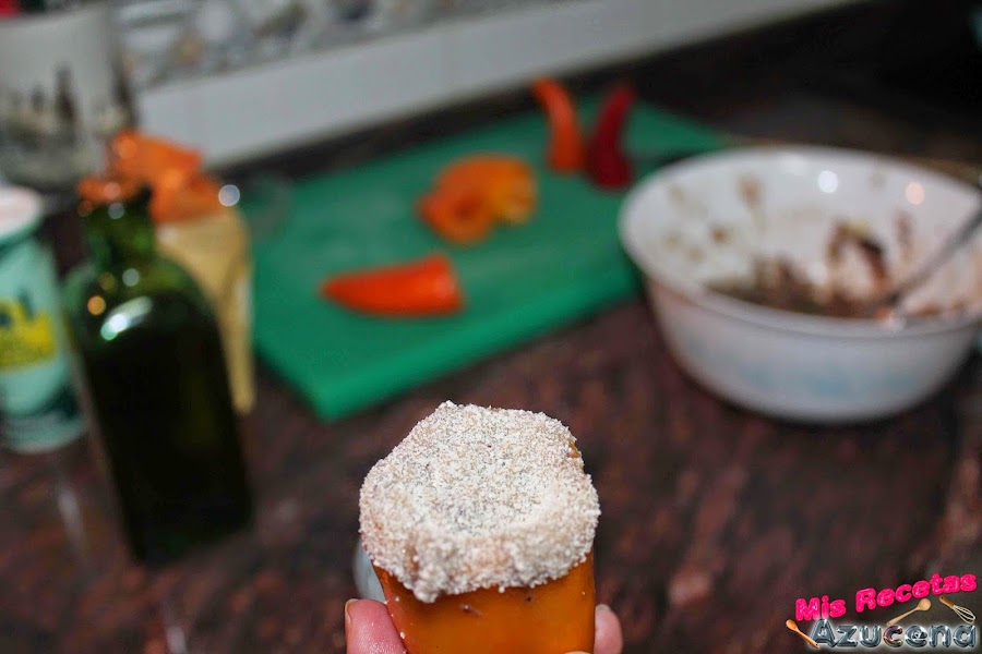 Mientras las patatas están en el horno cogeremos los pimientos y los lavaremos, le quitamos la parte del tallo y los lavamos bien para quitarle las semillas que lleven dentro.