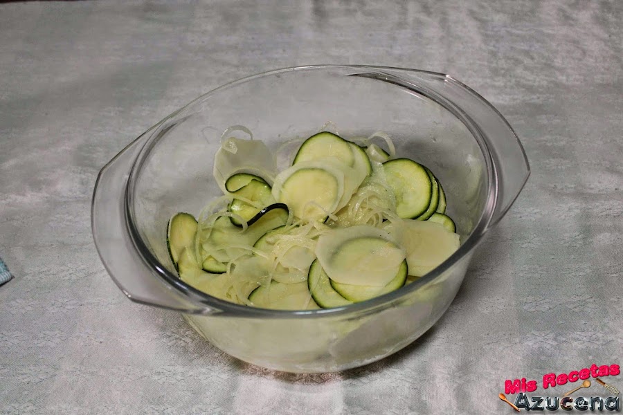 El calabacín lo lavaremos y lo picaremos con la piel del mismo tamaño que las patatas.