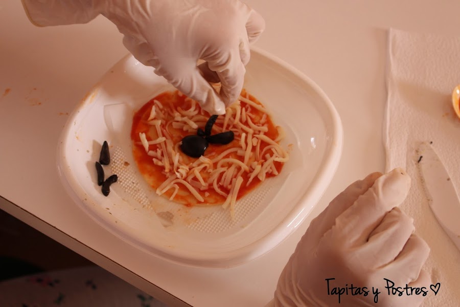 Ponemos el queso encima. Cortamos la aceituna y le damos forma de araña.