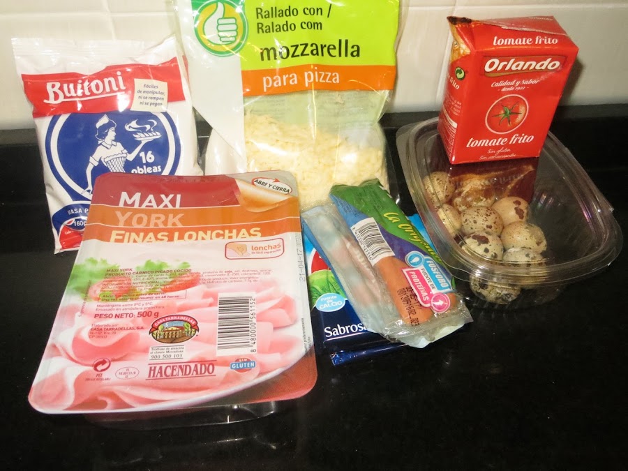 Colocamos las obleas de empanadillas y les untamos una capa de tomate, ponemos encima la mozzarella, unos trozos de tranchete de queso cheddar y luego las rellenamos con lo que más nos guste, en este caso hice unas de salchichas y jamón york y otras de jamón serrano, eche un poco de orégano por encima y las metí al horno durante 10 minutos a 200 grados. Luego algunas las decoré con un huevo de codorniz y ya están listas para comer, si queréis poder hacer el huevo al horno, aunque a mí me gusta más frito.