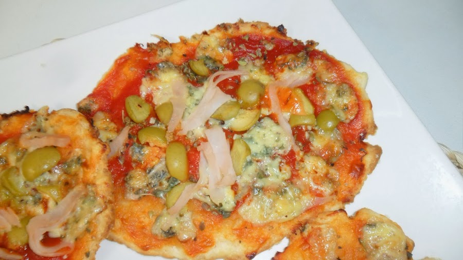 En la bandeja de horno, forramos con papel vegetal. Cortar porciones de masa de forma desigual y damos forma. Poner encima del papel las porciones de pizza. Pincelamos con abundante tomate frito casero, jamón york, lonchas de mozzarella, aceitunas rellenas, queso azúl, orégano, pimienta molida opcional.