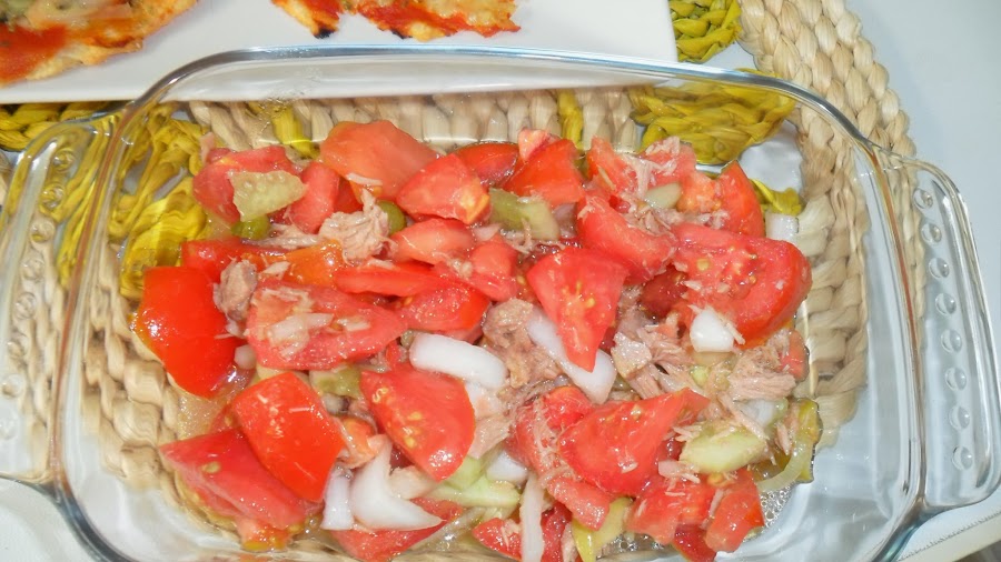 * 2 Tomates, Cebolleta, Atún en aceite ,Pimientos de piquillo, Aceite de oliva virgen extra y sal fina.