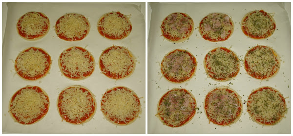 Toppings variados: lo que os guste: yo dejé algunas tal cual, tipo Margarita, y en otras puse jamón