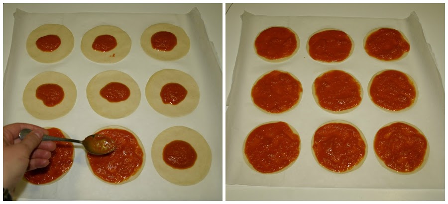 - Ponemos un par de cucharaditas de salsa de tomate por en encima y la distribuimos bien por toda la masa.