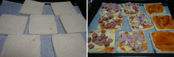 Cogemos una bandeja de horno con una hoja de papel vegetal, ponemos las rebanadas de pan de molde en la bandeja. Cubrimos la base de cada rebanada de pan con un poco de tomate frito, ponemos un trozo de queso en loncha, encima iremos poniendo jamón dulce, en otros bacon, en otros salchichas franfurt cortadas en rodajas.