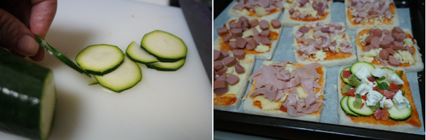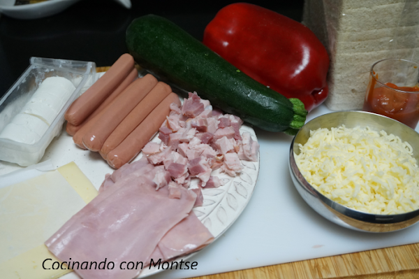 Para hacer estas mini pizzas he utilizado jamón dulce, bacon, salchichas franfurt y queso. La de verdura puse rodajas de calabacín muy finitas, pimiento rojo y verde y unos trocitos de queso de cabra. También se pueden añadir las especias que os gusten.