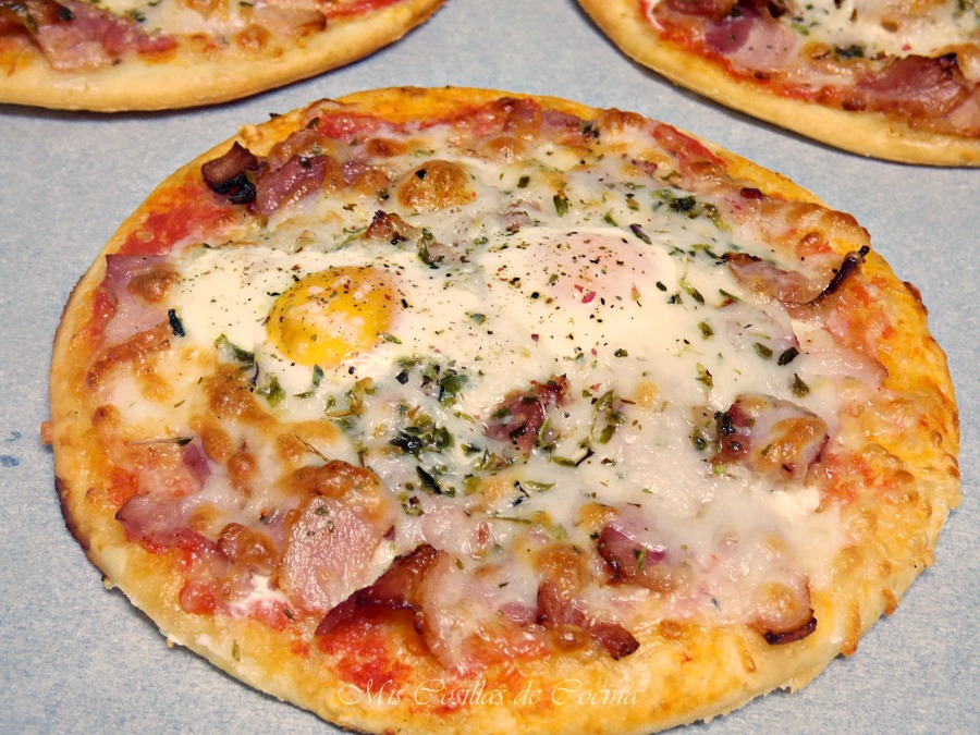 Estiramos la masa y cortamos círculos con un aro de emplatar o con un plato pequeño, ponemos tomate, un poco de queso emmental el beicón escurrido de la grasa, la mozzarella, espolvoreamos orégano, ponemos 2 huevos encima, salpimentamos y horneamos en la parte baja del horno.