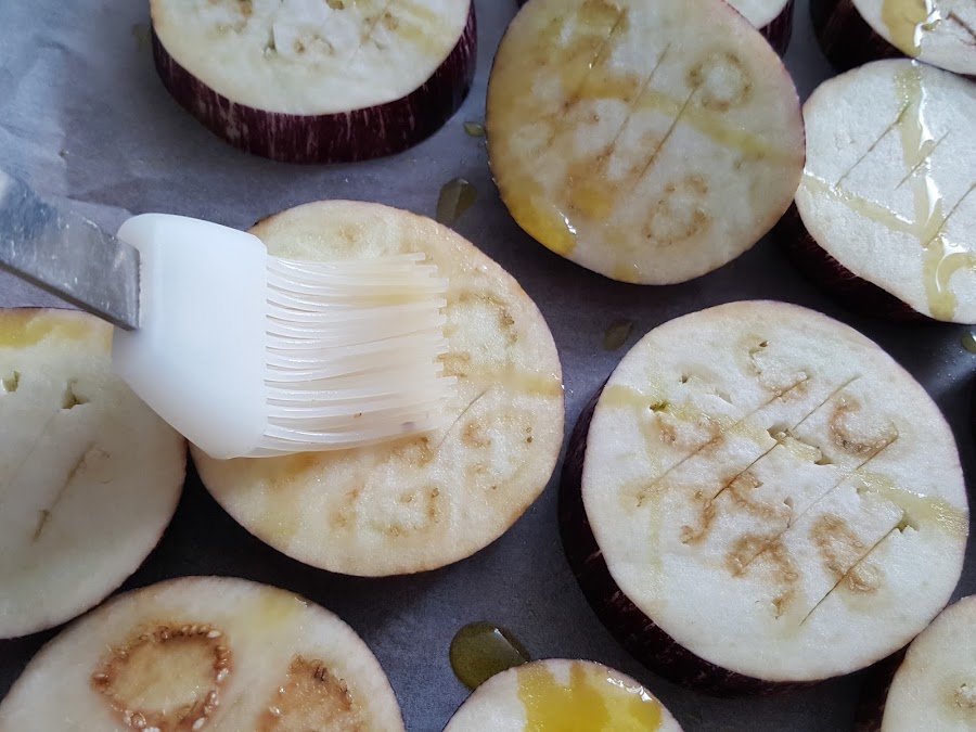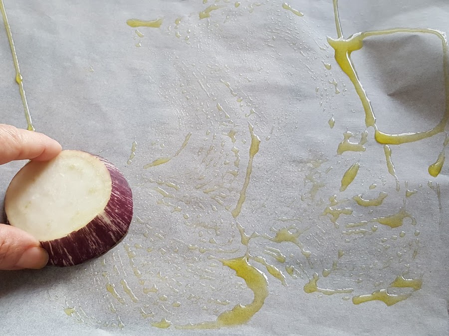 2. - Ponemos en la bandeja del horno un papel de hornear, le echamos un poco de aceite y, con una de las rodajas, extendemos el aceite.