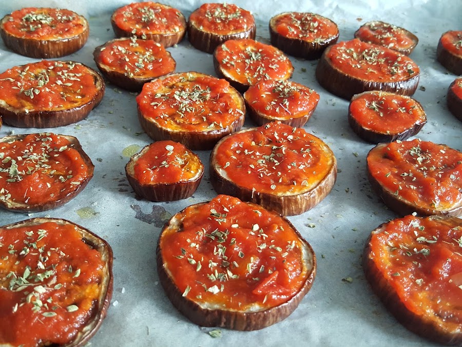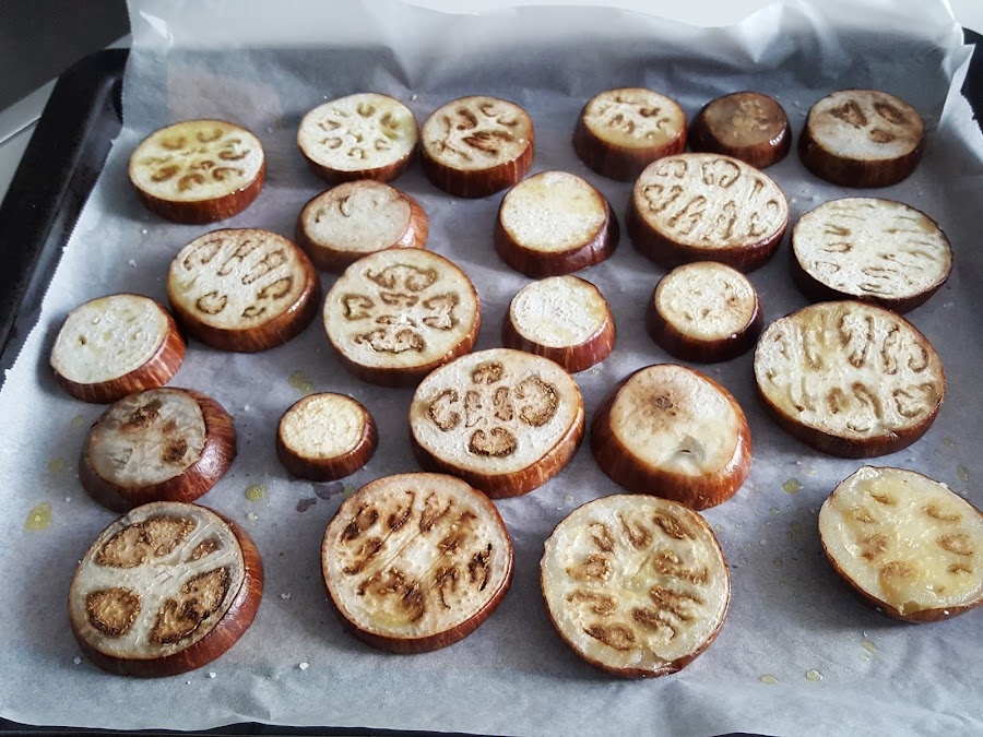 Como las berenjenas eran pequeñitas, han quedado como un aperitivo diferente, y os puedo asegurar que han encantado a todos.