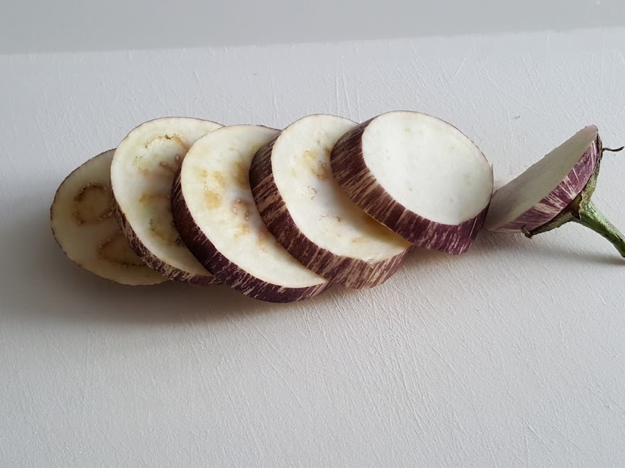 1. - Encendemos el horno a 180º y comenzamos lavando bien las berenjenas y cortándolas en rodajas gruesas, de casi un cm de ancho.