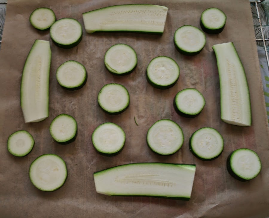 - Lavamos bien el calabacín y lo cortamos en rodajas redondas o alargadas. Yo hice de los dos tipos, aunque para servir en una fiesta me gusta y cunde más la opción redonda.