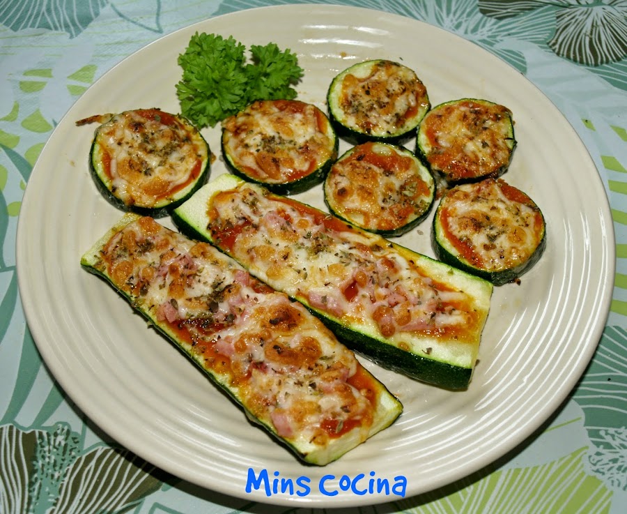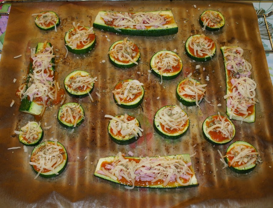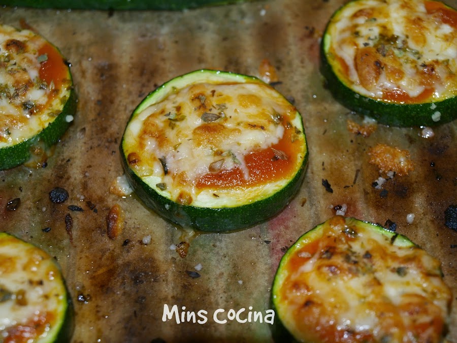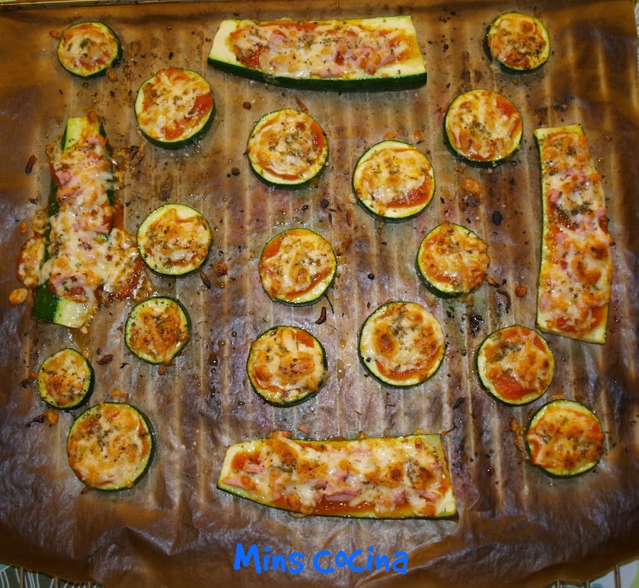 - Volvemos a sacar la bandeja del horno. Ponemos un poquito de salsa de tomate sobre los calabacines, mozzarella y orégano. Si os apetece poner algún topping, pues también. Yo las rodajas redondas las dejé tal cual, tipo pizza Margarita, y a las alargadas, algo más grandes, les añadí un poco de jamón en tiras.
