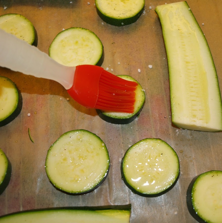 - Pasado el tiempo, sacamos la bandeja del horno y damos la vuelta a las rodajas de calabacín. Volvemos a pintar con un poco de aceite y metemos del nuevo al horno, igual que antes. Es mejor que el calabacín quede algo duro. Va a estar hecho igualmente, y así se puede coger luego mejor con la mano, a la hora de comerlo como un canapé.
