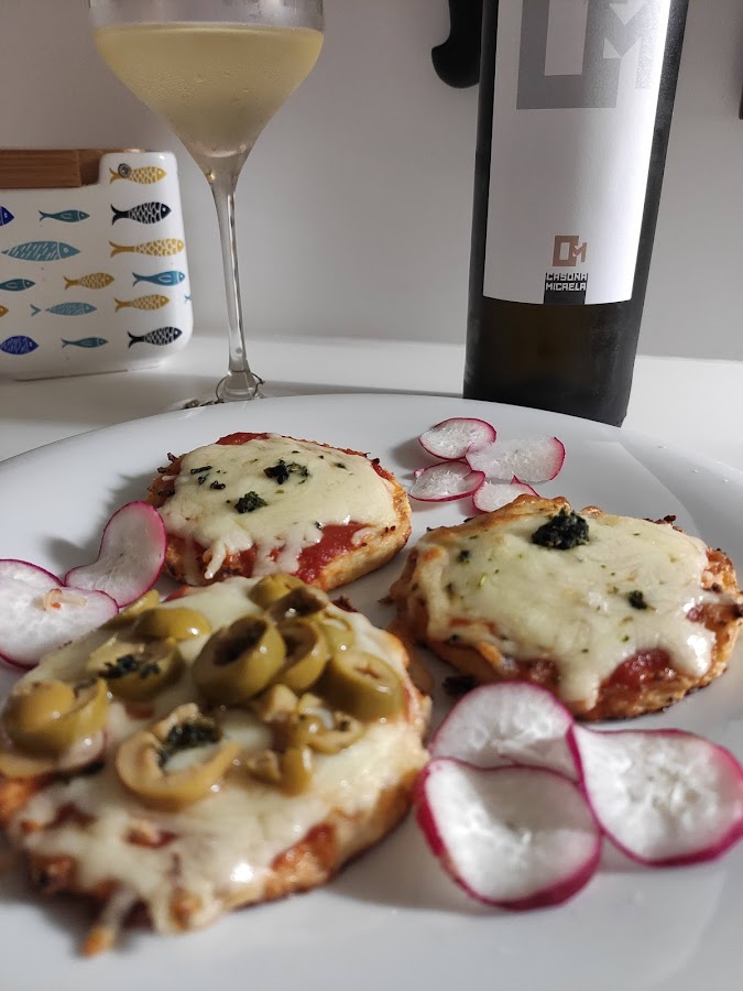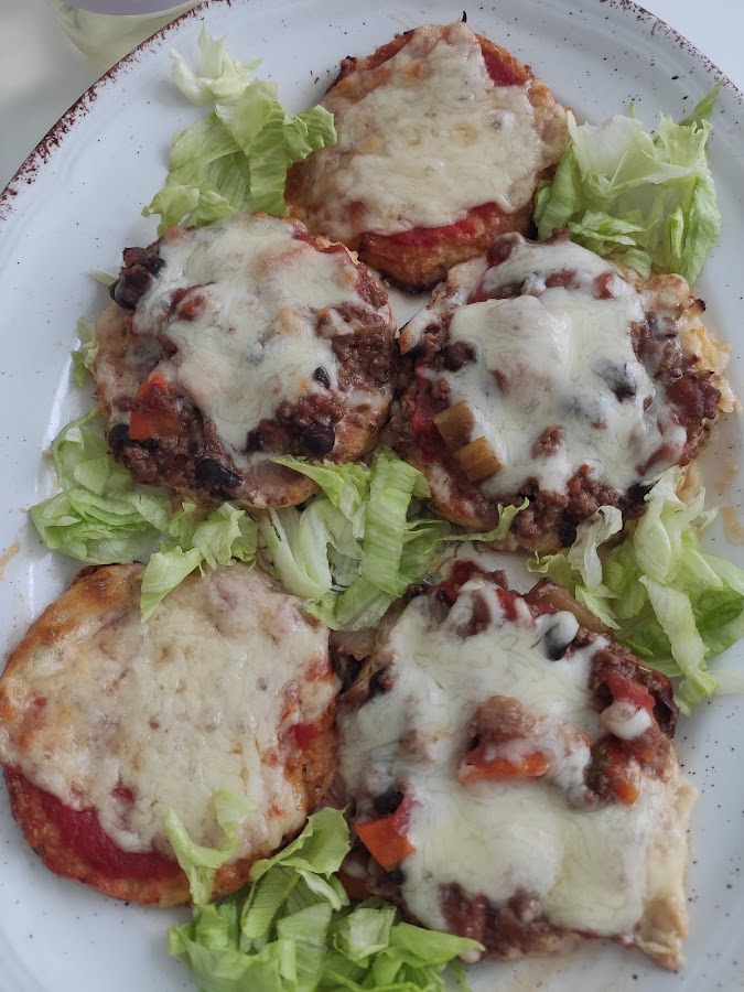 Sacamos del horno y añadimos los ingredientes que hayamos escogido; queso, pimiento, tomate, aceitunas etc. (Yo hice unas de carne picada que me había sobrado de hacer chili con carne).