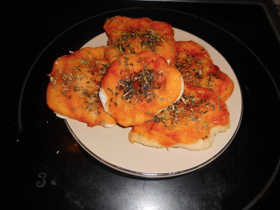 Cogemos pequeños trozos de masa y le damos forma las ponemos en la placa del horno las untamos en tomate, oregano, romero, tomillo y sal.