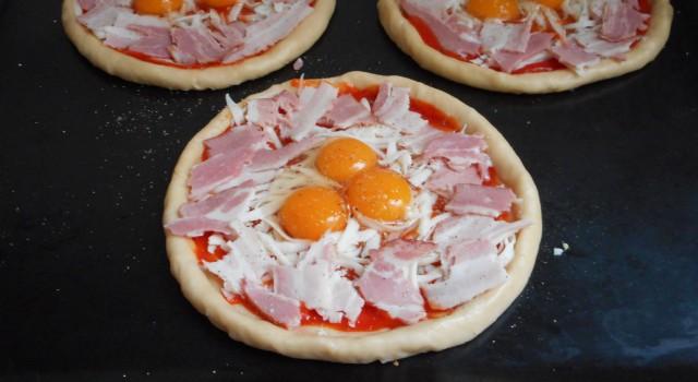 Los ingredientes del relleno son a gusto, esta lleva: tomate frito, mozzarella rallada, bacon y los huevos de codorniz.