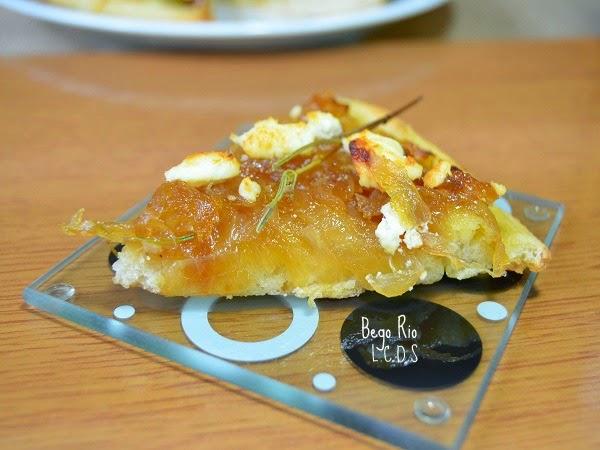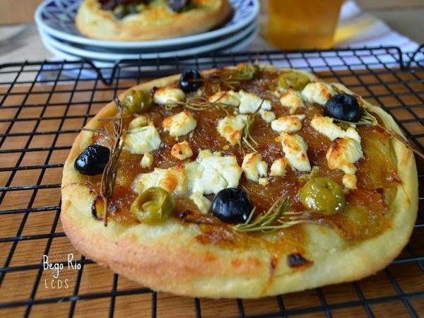 Para la de cebolla caramelizada , pondremos sobre la base cebolla caramelizada , sobre ésta trocitos de queso de cabra, unas ramitas de romero y aceitunas negras y verdes.