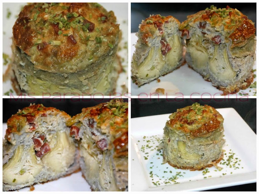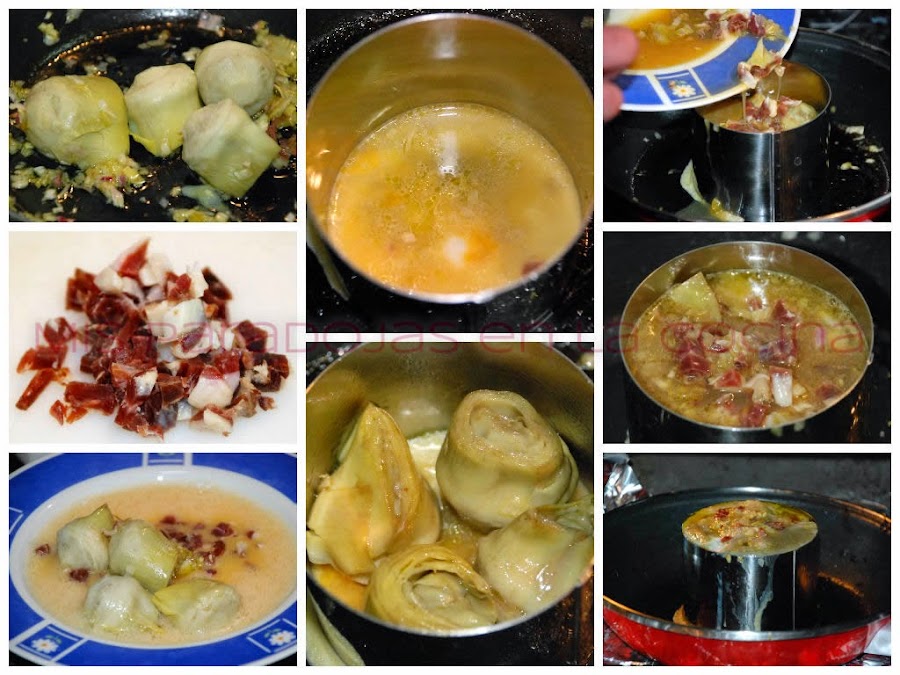 Precalentar el horno a 180º. Pocharemos en una sartén apta para el horno la cebolleta picada con un punto de sal. Cuando esté poniéndose transparente, añadiermos las alcachofas y rehogamos. Agregamos el jamón serrano también picado y seguimos rehogando. Batimos 2 huevos e incorporamos las alcachofas con jamón. En la misma sartén a fuego vivo, ponemos un aro para emplatar y vertemos dentro un poco del huevo batido para hacer el fondo del pudding. Es normal que se os escape algo de huevo pero en pocos minutos lo tendremos sellado. A continuación, bajamos a fuego moderado, disponemos las alcachofas, añadimos el resto del batido y dejaremos al fuego unos minutos. Introducimos la sartén en el horno y dejamos cocinar hasta que esté en su punto.