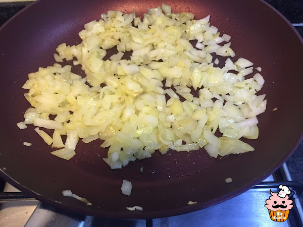 Sofreir la cebolla en una sartén con aceite a fuego lento y que se vaya dorando. Una vez la cebolla esté ya hecha, añadir las setas a la sartén. Cuando la verdura ya esté, retiramos del fuego y reservamos