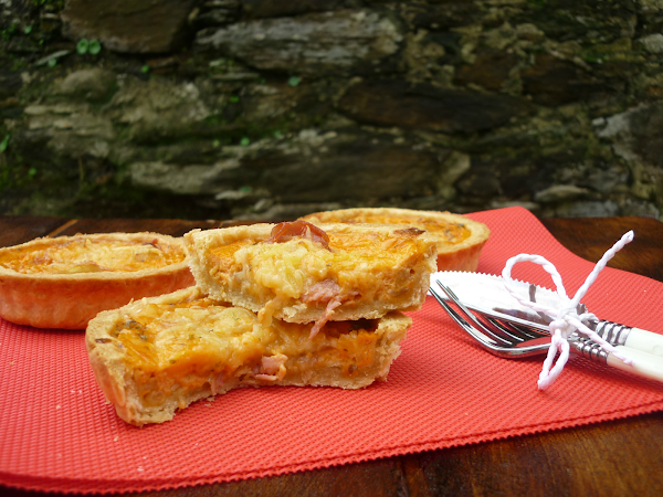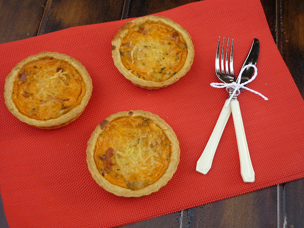 Pinchar la masa con un tenedor y cubrir con papel de horno y garbanzos. Precalentar a 190º y hornear 10 minutos. Quitar el papel y los garbanzos y meter 5 minutos más en el horno. Bajar la temperatura a 170º, rellenar las tartaletas, poner un poquito de queso encima y hornear unos 20 minutos.