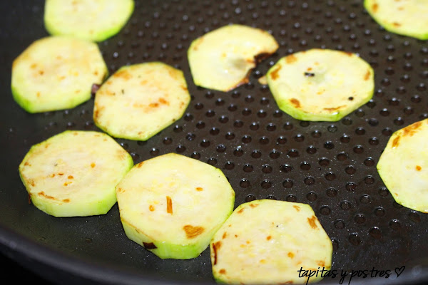 En la misma sartén doramos las rodajas del medio calabacín que nos quedaba.