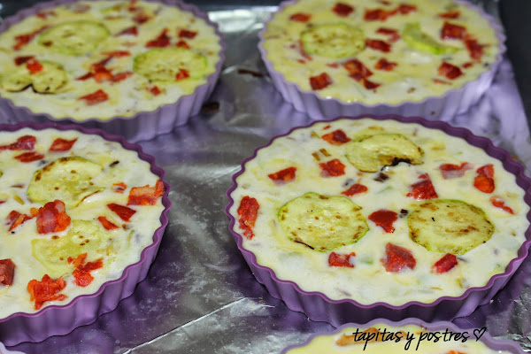 Y vertemos la mezcla sobre las tartaletas. Yo he hecho cuatro con base de masa quebrada y dos sin base. Colocamos las rodajas de calabacín y los taquitos de chorizo. Horneamos hasta que veamos que el relleno está cuajado. Unos veinte minutos, según cada horno.