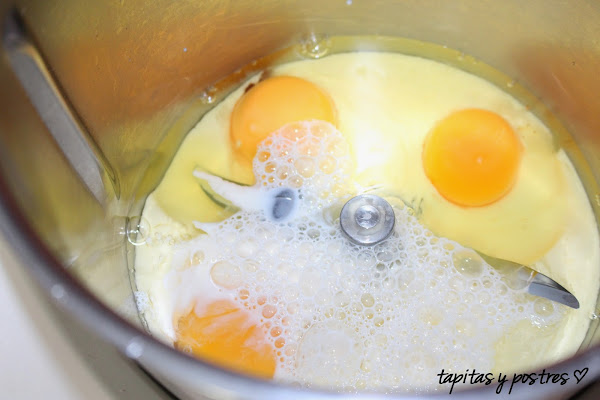 Y ahora batimos los huevos con la leche evaporada. Yo lo he hecho en thermomix, 30 segundos a velocidad 4. Se puede hacer igual con la batidora eléctrica.