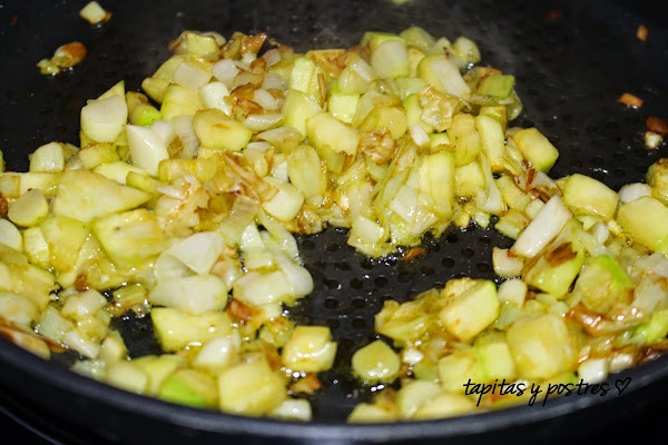 Sofreímos los puerros y el medio calabacín, todo picado unos minutos hasta que estén tiernos. Dejamos reservado.