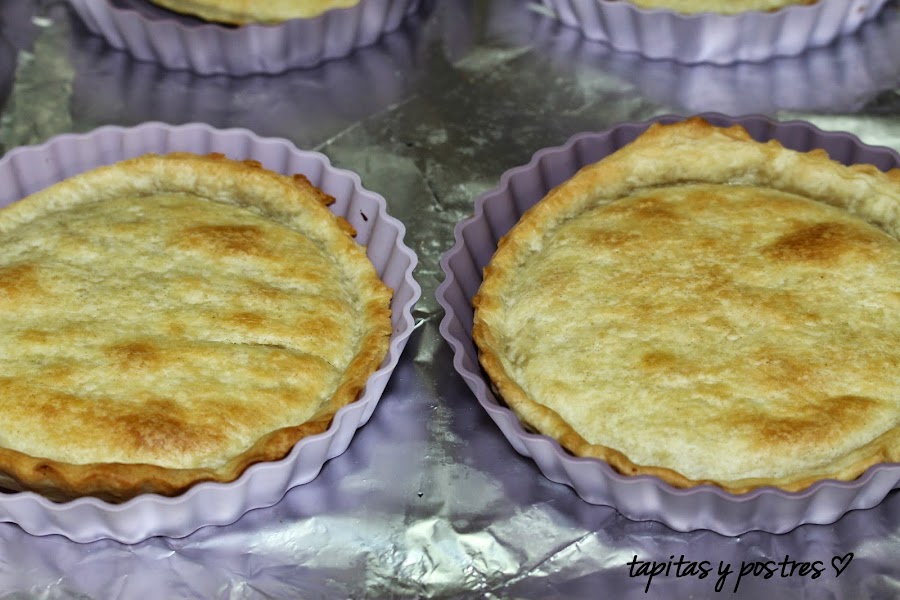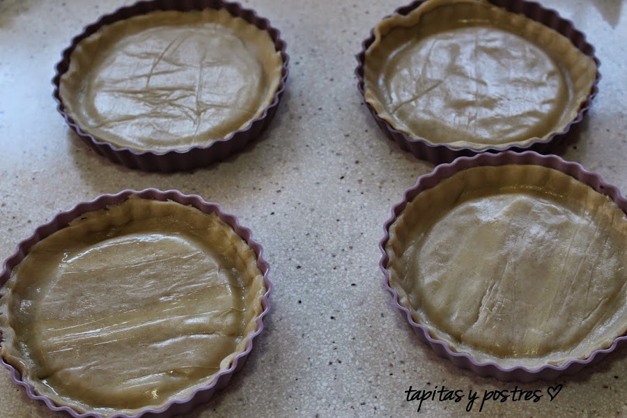 Preparamos las bases forrando unos moldes de tartaletas con discos de masa quebrada. Los horneamos un poquito para que la base esté crujiente y no se reblandezca.