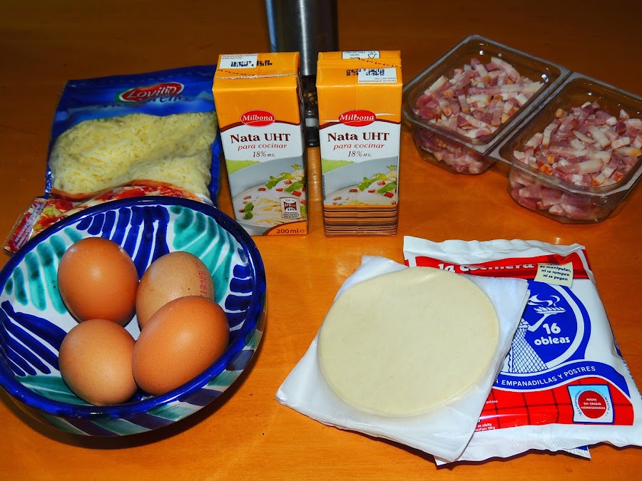 20 placas de masa para empanadillas La Cocinera, 250 gr. de queso rallado, 200 gr. de bacon,