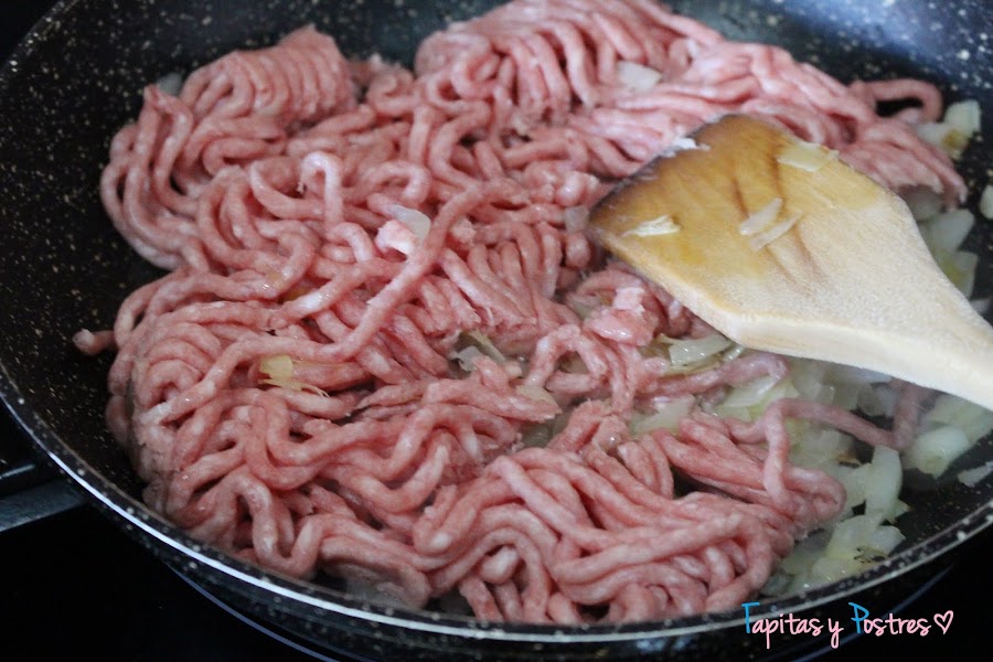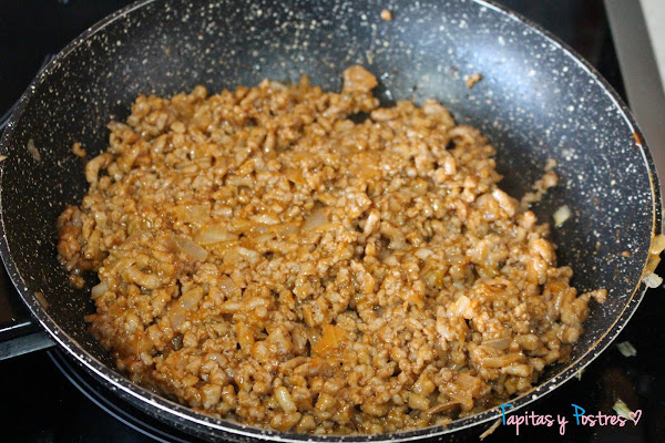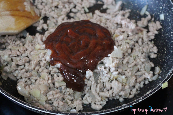 Añadimos la carne picada, sazonamos y damos unas vueltas hasta que esté hecha. Entonces añadimos la salsa barbacoa y mezclamos bien. Dejamos enfriar.