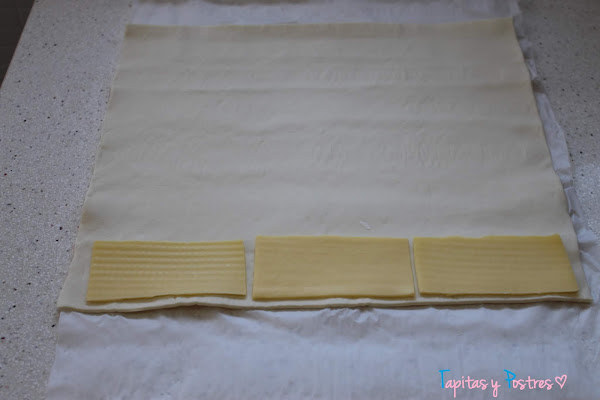 Extendemos el hojaldre. Ponemos las mitades de las lonchas de queso en un extremo.