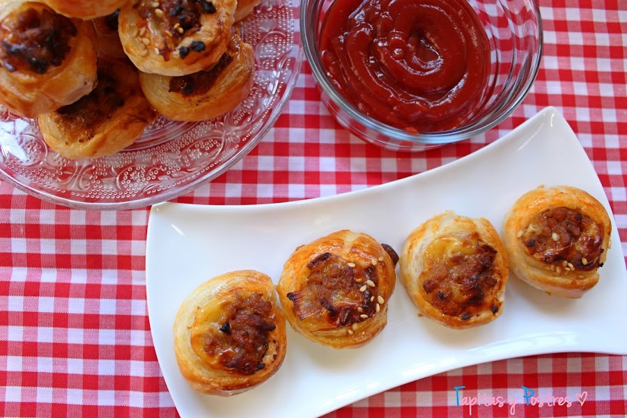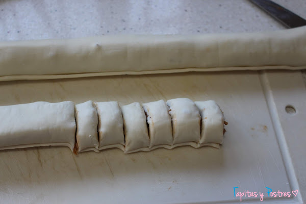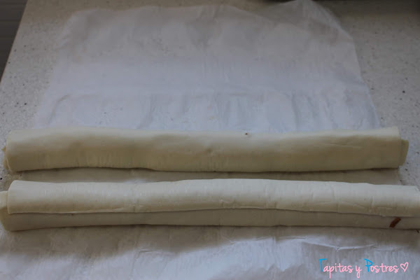 Enrollamos hasta formar un rulo que llegue a la mitad de la plancha de hojaldre. Cortamos y con la otra mitad hacemos lo mismo.