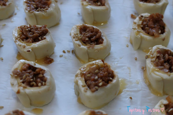 Los colocamos en una bandeja de horno con papel vegetal. Pintamos con huevo batido y espolvoreamos semillas de sésamo. Yo les puse a algunos si y a otros no. Horneamos.