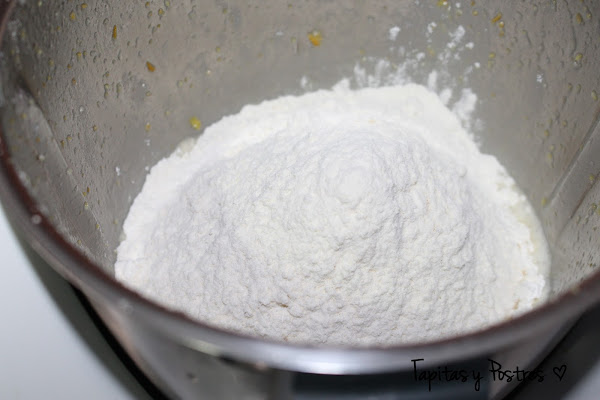 Echar la mitad de la harina y mezclar 10 segundos a velocidad 4.